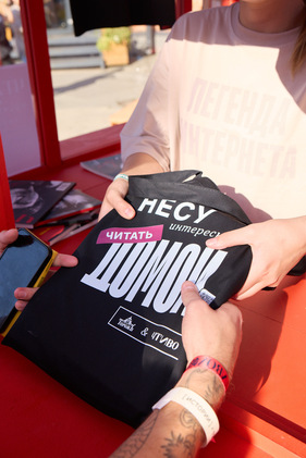 На площадке работал киоск ЧТИВА: приобрести любой номер можно было вместе с футболками, ароматами «ТИРАЖ» и HOLYNOSE. Покупки аккуратно упаковывали в отдельный шопер, выпущенный с партнером — строительной компанией «Теремъ».