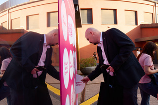 В зеркальном кубе Яндекс Пэй, по форме напоминающем две «складные книги», как отсылка к ЧТИВУ и двум сценариям оплаты в приложении, гости делали стерео-варио-кадры, а на выходе забирали мерч — обвес для сумки со своей фотографией.