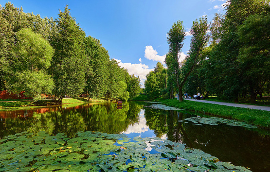 Каскад прудов, утки, въездные ворота с башнями XVIII века. Весной и осенью парк почти пустой. Можно час идти без цели и без наушников. В Москве это роскошь.
