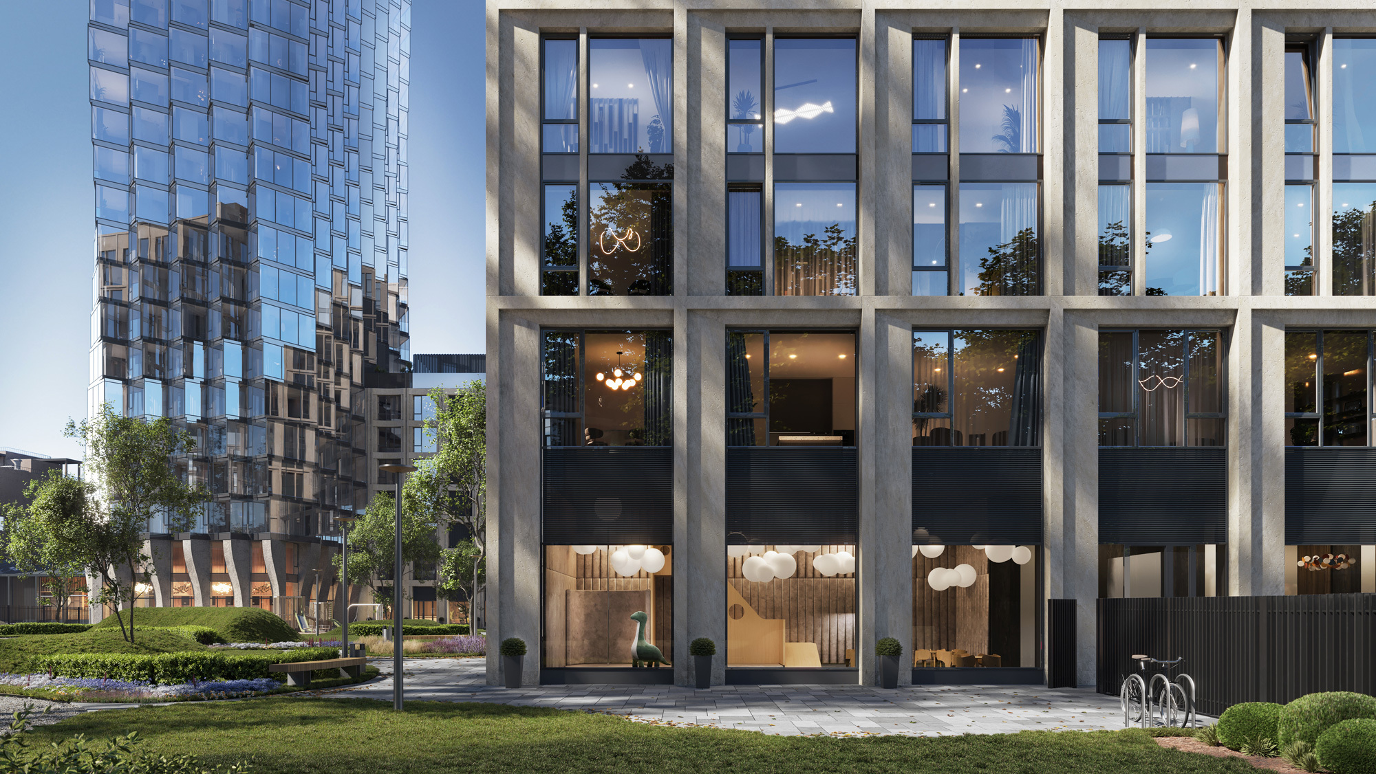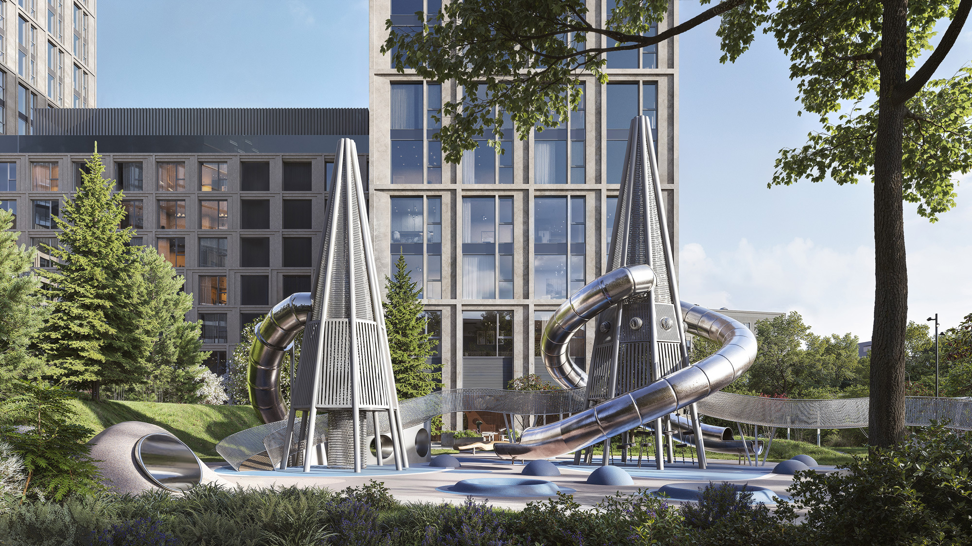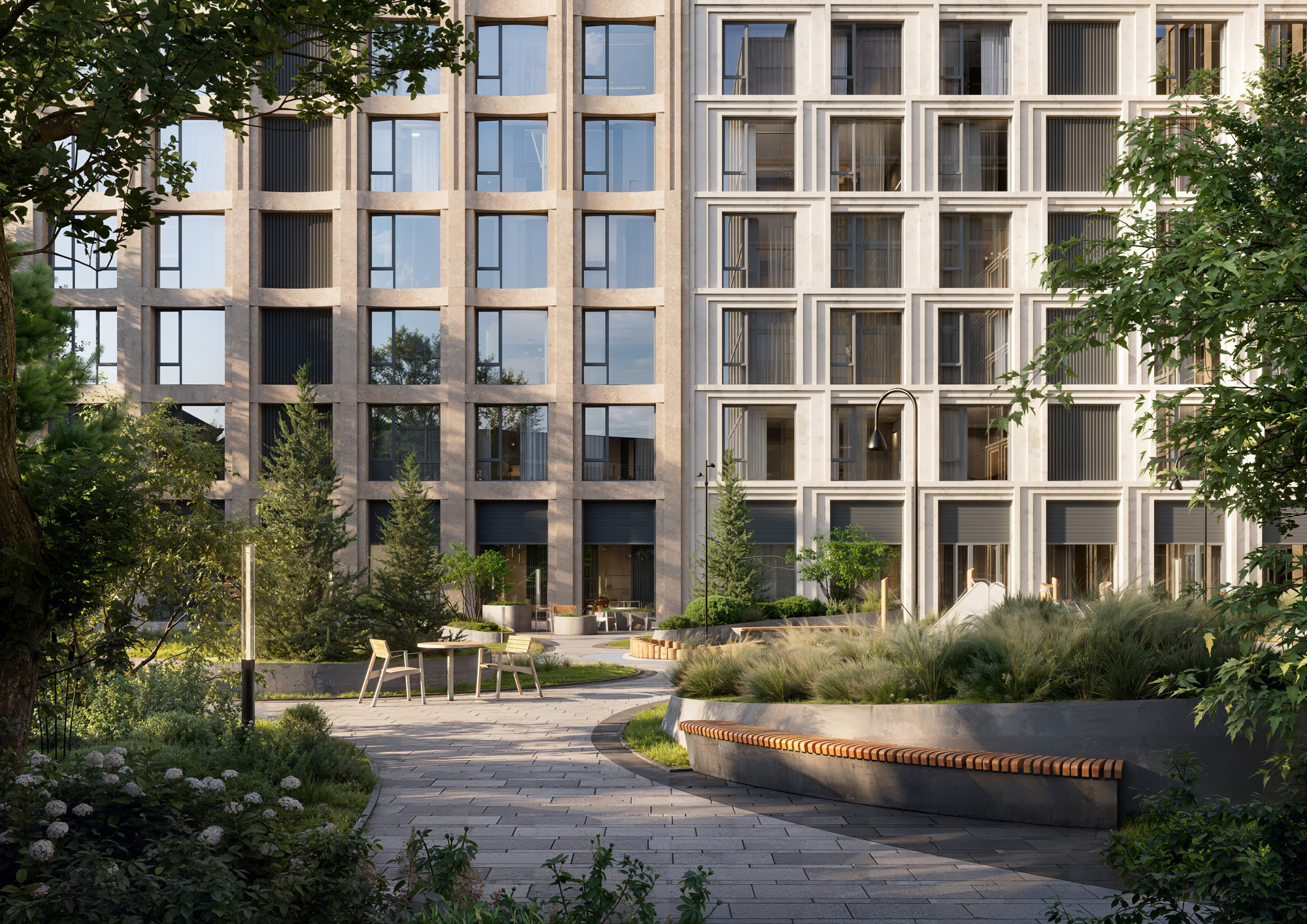 Под окнами разбит парк в альпийском стиле с хвойными деревьями, кустарниками, магнолиями и гортензиями сорта Mont Blanc (Монблан). Его размер неординарен для центра Москвы — почти 7000 кв. м, что сравнимо с футбольным полем. Во дворе будет всесезонный сад с копиями горных ландшафтов, галереей берсо, амфитеатром, уютным павильоном и детской инфраструктурой, которая включает в себя две разновозрастные площадки и закрытый детский клуб.