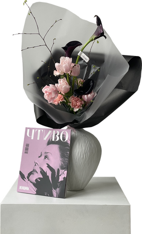 Выразительная и в то же время нежная обложка нового ЧТИВА вдохновила наших друзей из цветочного ателье «ÁСТРА» на Варварке на создание особенного букета. В нем черные каллы сочетаются с розовыми тюльпанами и диантусами, а завершают образ тонкие ветви с молодыми листьями — как предчувствие скорой весны. Нежная цветочная композиция упакована в строгий черный крафт. Этот букет будет в продаже в ателье «ÁСТРА» до середины марта, и вместе с ним вы получите в подарок номер ЧТИВА, посвященный женщинам.